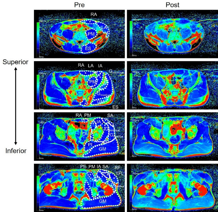 Table 3 shows the percent change in T2 values before and after the 60-m round-trip sprint. There was a significant difference in the rate of change in T2 values between the muscles. The rate of change in T2 values was particularly high for the lateral abdominal, psoas major, erector spinae, gluteus maximus, and pectineus muscles compared with the other muscles.