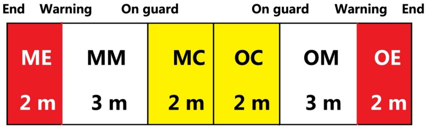 Note: The areas were defined based on both fencers. For each fencer, the piste could be divided into 6 areas. ME, my own end area; MM, my own middle area; MC, my own central area; OC, opponent’s central area; OM, opponent’s middle area; OE, opponent’s end area