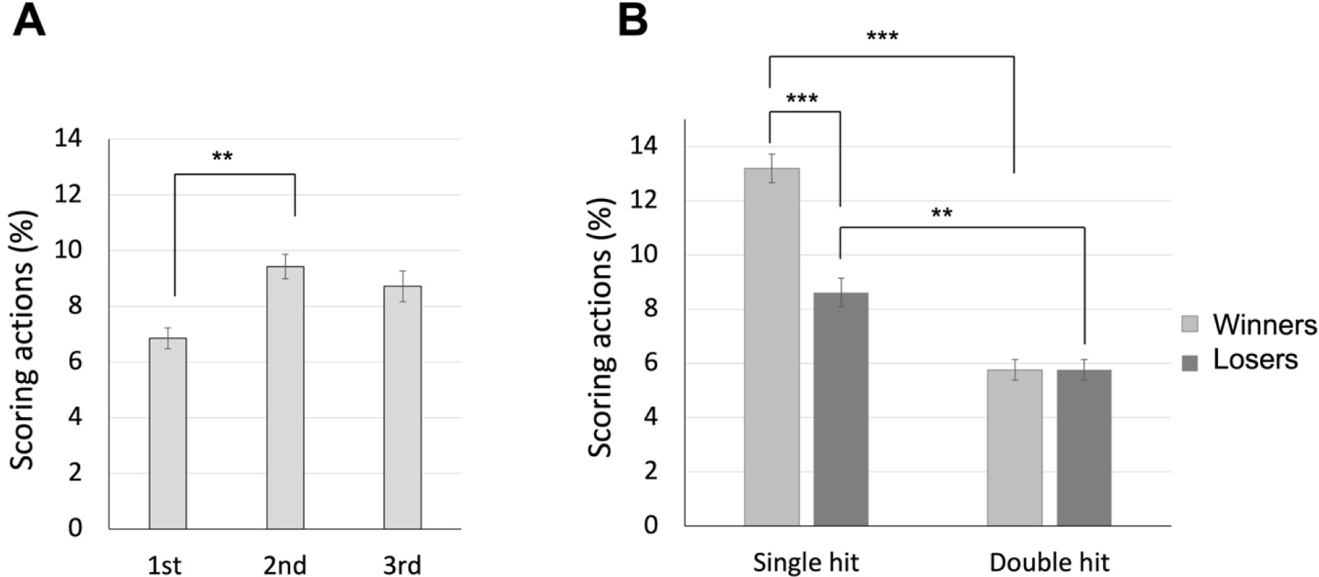 The 2 (bout results: winners vs. losers) x 2 (hit results: single hits vs. double hits) x 3 (rounds: 1st vs. 2nd vs. 3rd) ANOVA revealed significant main effects for all factors. Firstly, there was a significant main effect of bout results, F(1, 88) = 77.599, p < 0.001, ηp2 = 0.469, with the winners showing a higher percentage of scoring actions than losers (mean values of 9.48% and 7.19% for winners and losers, respectively). Secondly, there was a significant main effect of hit results, F(1, 88) = 74.031, p < 0.001, ηp2 = 0.457, with fencers achieving a greater percentage of single hits than double hits (mean values of 10.90% and 5.76% for single and double hits, respectively). The main effect of rounds was also significant, F(1.676, 147.512) = 5.967, p = 0.005, ηp2 = 0.064, with fencers showing a higher percentage of scoring actions in the 2nd round than in the 1st round (p < 0.001; mean values of 6.86%, 9.43%, and 8.72% for the 1st, 2nd, and 3rd round, respectively; Figure 2A). Moreover, a significant bout results x hit results interaction was observed, F(1, 88) = 14.706, p < 0.001, ηp2 = 0.143 (Figure 2B). Post hoc analyses indicated winners achieved more single hits than losers (p < 0.001; mean values of 13.19% and 8.61% for winners and losers, respectively), while there were no significant differences in gaining double hits between the two groups (p = 1.000, mean values of 5.76% for both winners and lowers). On the other hand, both winners and losers had a greater percentage of single hits than double hits (p values < 0.005). The other interaction effects were not significant: bout results x rounds interaction, F(2, 176) = 0.419, p = 0.658, ηp2 = 0.005; hit results x rounds interaction, F(2, 176) = 2.793, p = 0.064, ηp2 = 0.031; and three-way interaction, F(2, 176) = 0.691, p = 0.539, ηp2 = 0.007.