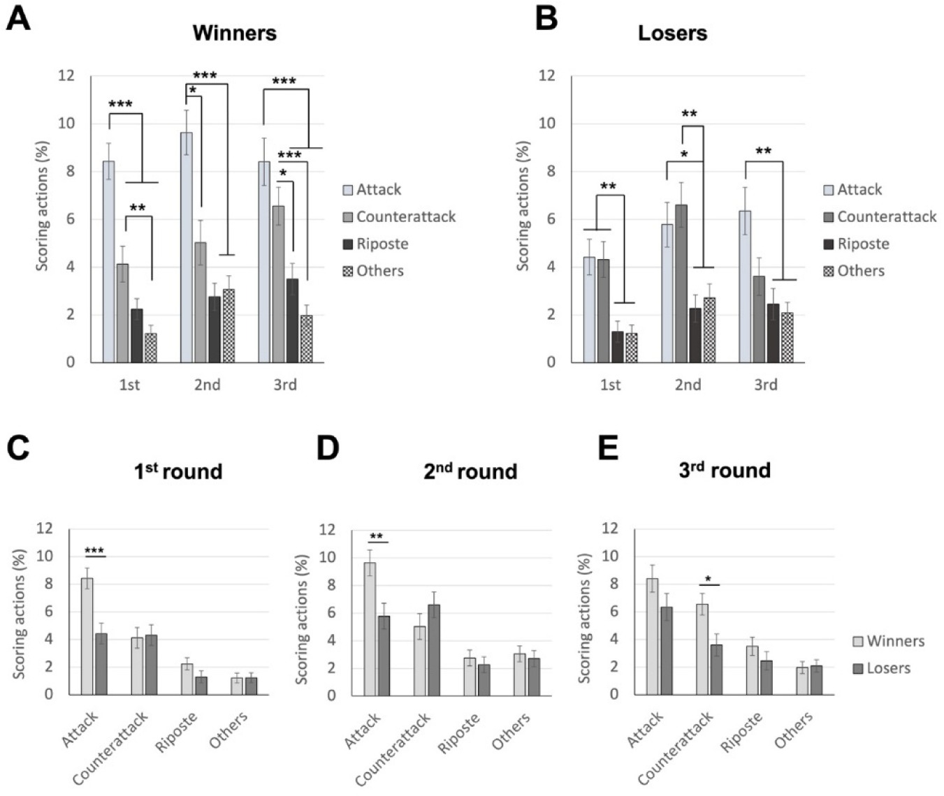 The average percentage of scoring techniques for winners and losers across rounds; top panels demonstrate data for winners (panel A) and losers (panel B), respectively; bottom panels demonstrate data for 1st (panel C), 2nd (panel D), and 3rd (panel E) rounds, respectively.