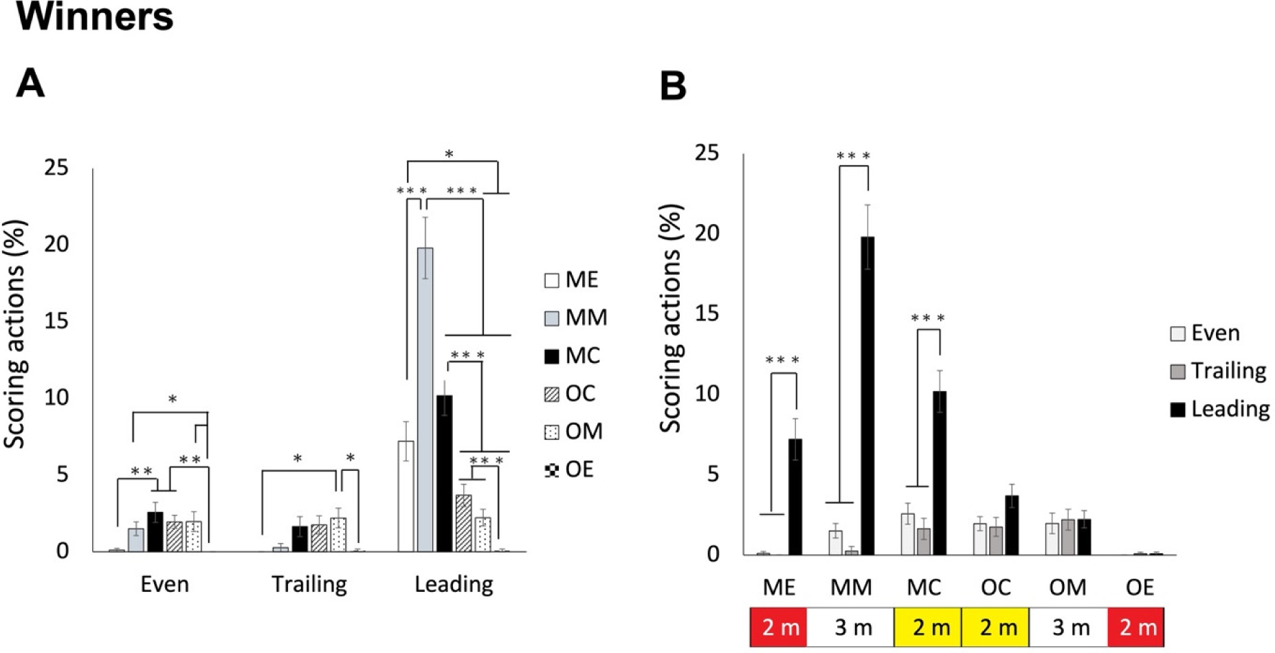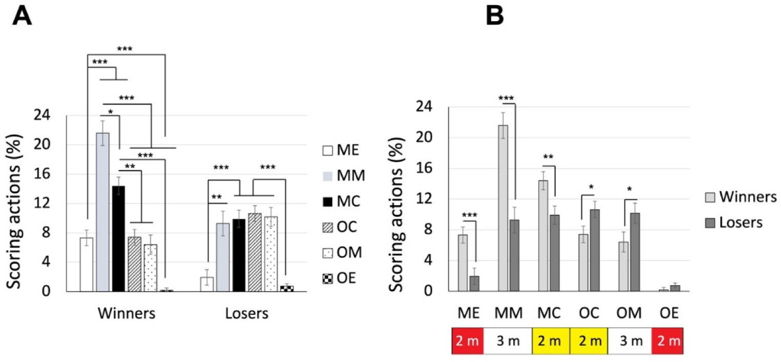 Note: The areas were defined based on both fencers. For each fencer, the piste could be divided into 6 areas. ME, my own end area; MM, my own middle area; MC, my own central area; OC, opponent’s central area; OM, opponent’s middle area; OE, opponent’s end area. * p < 0.05, ** p < 0.005, *** p < 0.001