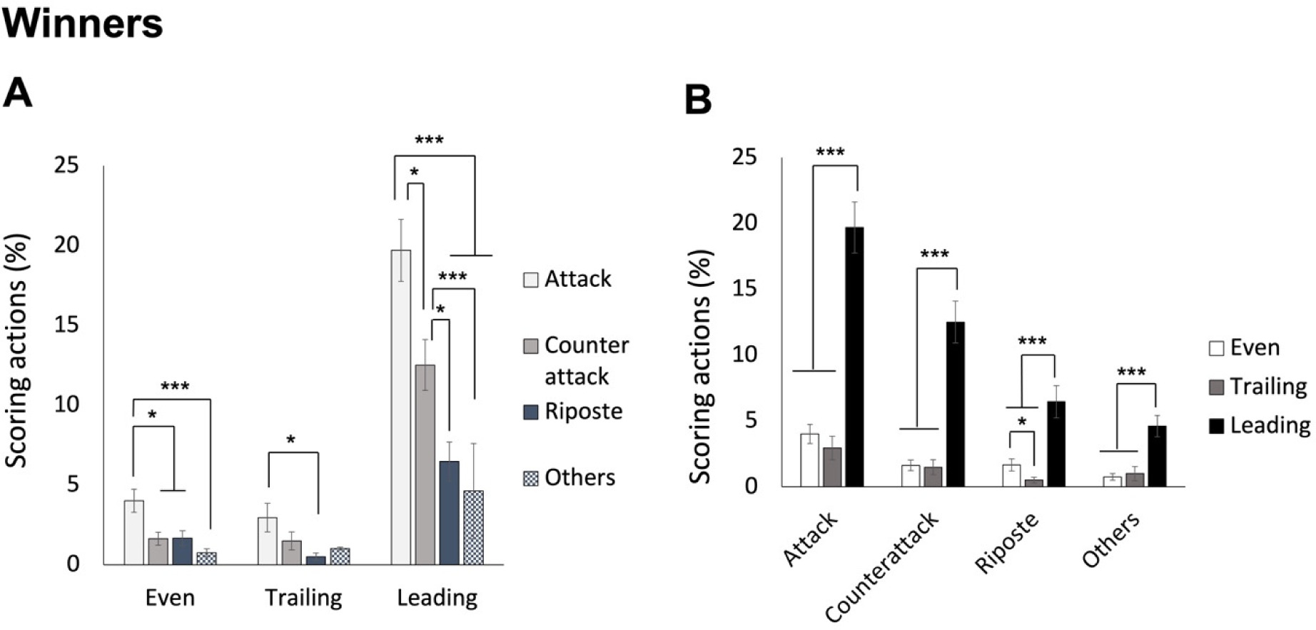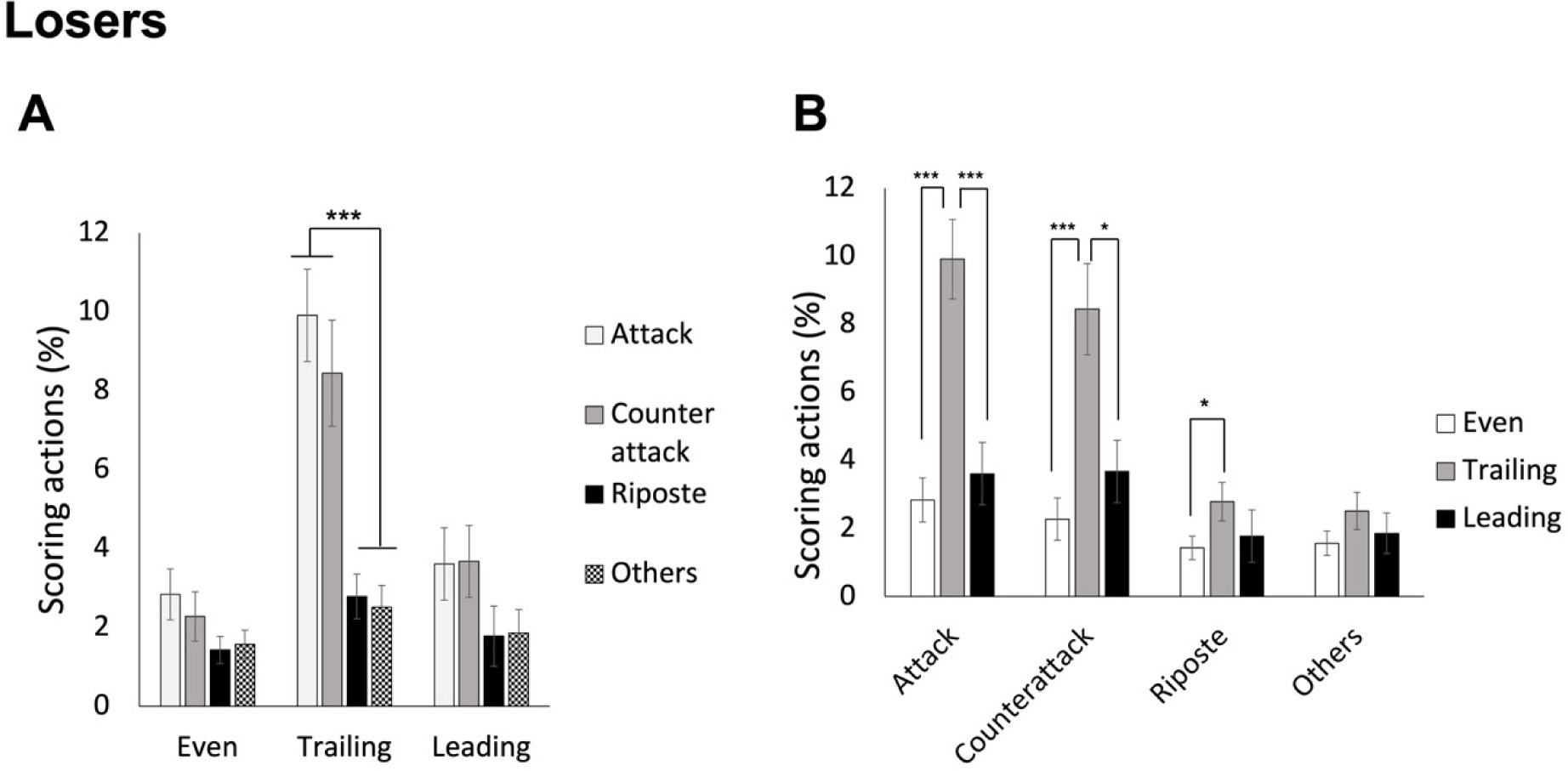 For winners, ANOVA revealed a significant interaction effect, F(3.048, 134.110) = 12.302, p < 0.001, ηp2 = 0.218. As shown in Figure 5A, post hoc analyses indicated that when leading, winners scored through attacks most frequently, followed by counterattacks, and then ripostes and other techniques (mean values of 19.70%, 12.51%, 6.46%, and 4.62%, for attack, counterattack, riposte, and other techniques, respectively). While the score was even, the attack was still scored most frequently, followed by all the other three types of techniques (mean values of 4.01%, 1.63%, 1.67%, and 0.76%, for attack, counterattack, riposte, and other techniques, respectively). When winners were trailing in scores, the attack was still the most performed scoring action, but it was the riposte that was the least used (mean values of 2.96%, 1.49%, 0.51%, and 1.01%, for attack, counterattack, riposte, and other techniques, respectively). On the other hand, as shown in Figure 5B, the differences between leading and the other two score statuses were significant for all techniques (p values < 0.005), and specifically for the riposte, the differences between even and trailing score conditions were also significant (p = 0.037).