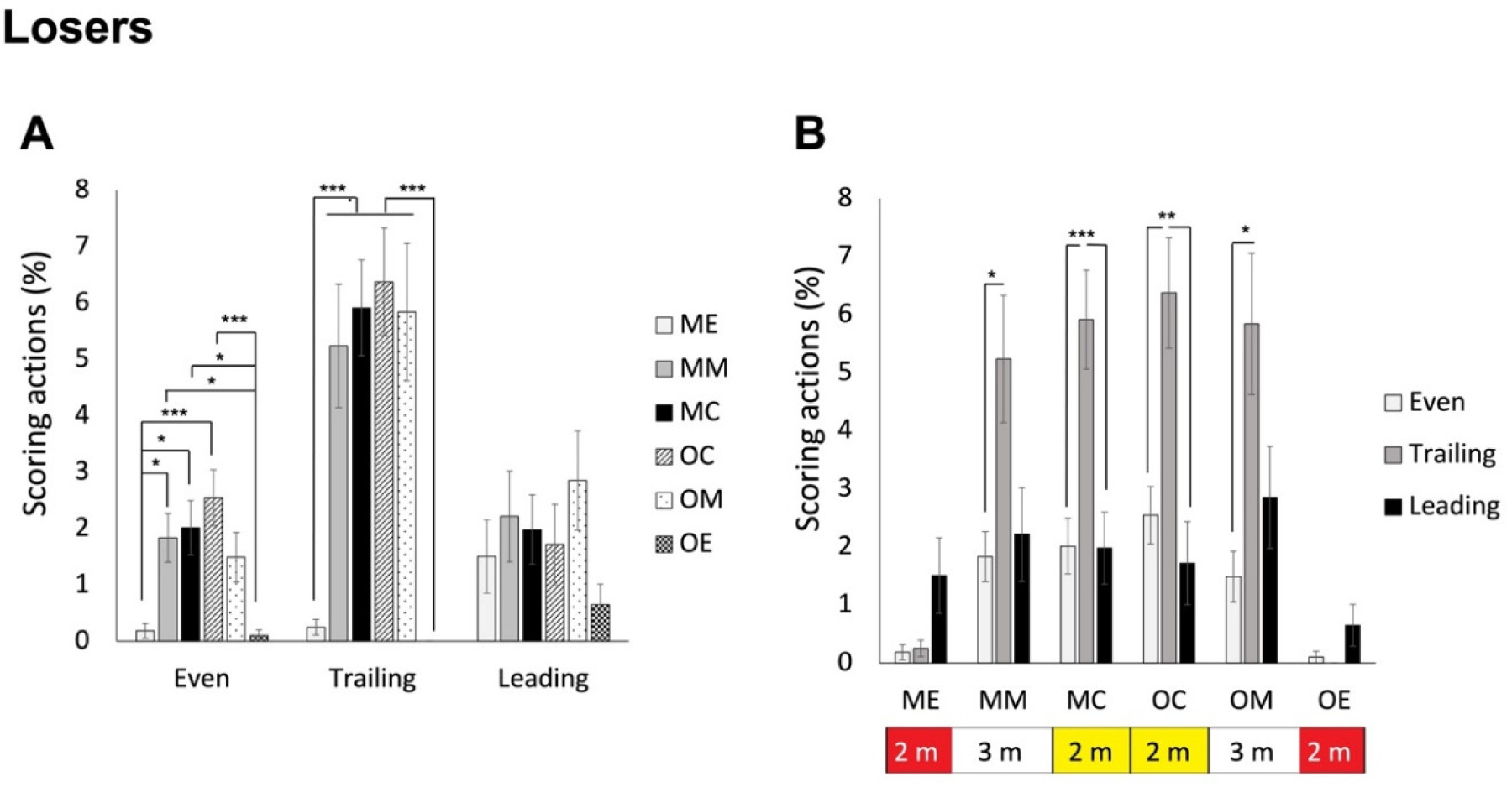 For losers, ANOVA revealed a significant interaction effect, F(4.273, 188.006) = 4.457, p < 0.001, ηp2 = 0.092. As shown in Figure 8A, post hoc analyses indicated that when the score was even, fencers scored in the middle and central areas of both sides more frequently than in the end areas of both sides (mean values of 0.19%, 1.83%, 2,01%, 2.54%, 1.49%, and 0.10% for ME, MM, MC, OC, OM, and OE areas, respectively). A similar trend was found when they were trailing (p < 0.001; mean values of 0.25%, 5.24%, 5.91%, 6.37%, 5.84%, and 0.00% for ME, MM, MC, OC, OM, and OE areas, respectively). Instead, whey they were leading, there were no differences among the areas (mean values of 1.51%, 2.21%, 1,98%, 1.72%, 2.85%, and 0.65% for ME, MM, MC, OC, OM, and OE areas, respectively). On the other hand, as shown in Figure 8B, the differences between trailing and the even status were significant for central and middle areas of both sides (p values < 0.01), additionally with significant differences between trailing and leading areas for central areas of both sides (p values < 0.005), whereas the differences among all statuses for the end areas of both sides were all not significant (p values > 0.083).