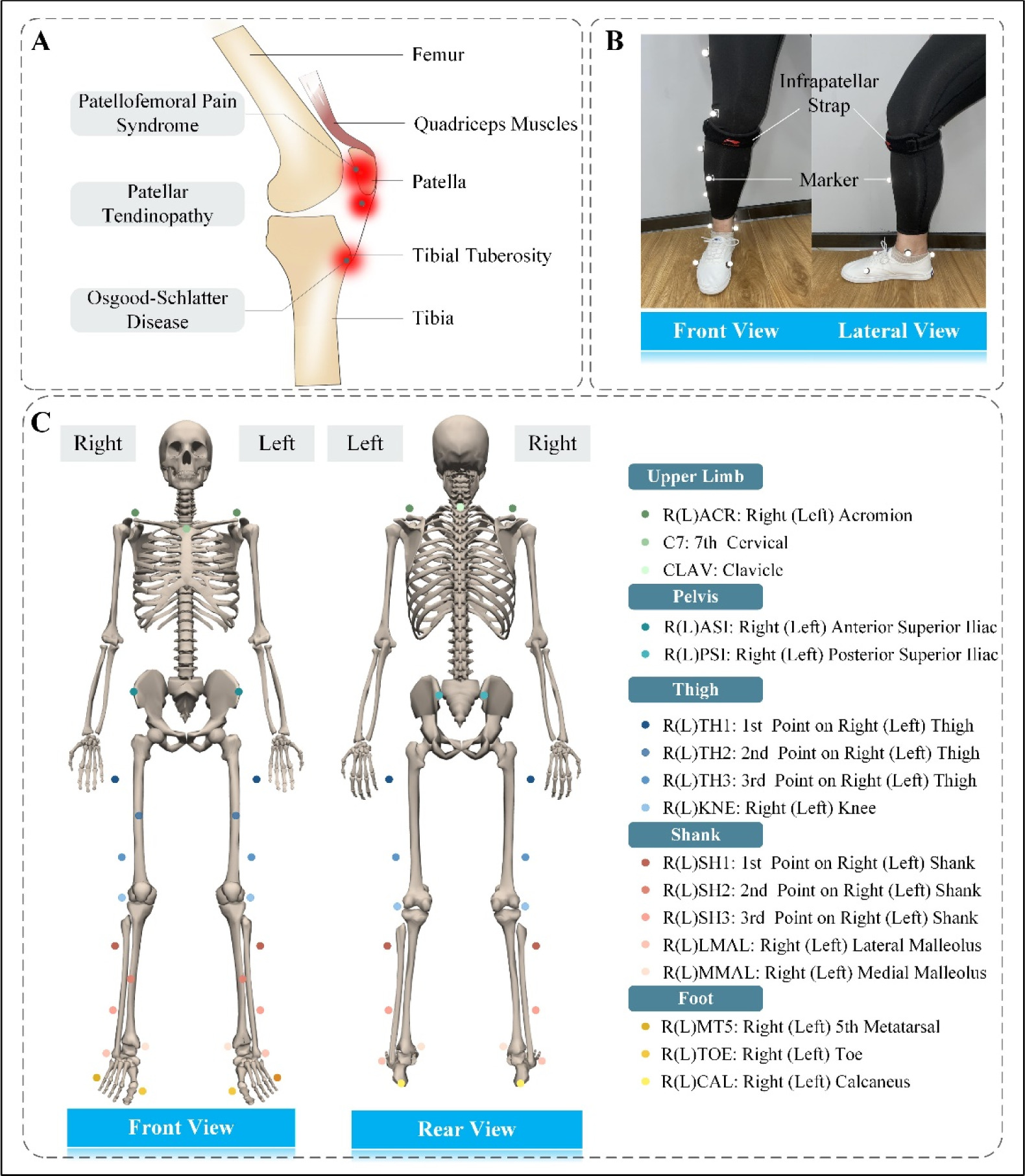Common sites of a few running-related anterior knee injuries and the experimental setup. (A) Lateral view of the knee joint. Red areas represent the common sites for patellofemoral pain syndrome, patellar tendinopathy, and Osgood-Schlatter disease. (B) Participants wearing the infrapatellar straps. (C) Position of the Vicon markers in front and back views (skeleton from OpenSim). A total of 32 markers were placed, and the locations were the shoulder, C7 vertebra, clavicle, anterior and posterior superior iliac, thighs, knees, shanks, and feet.