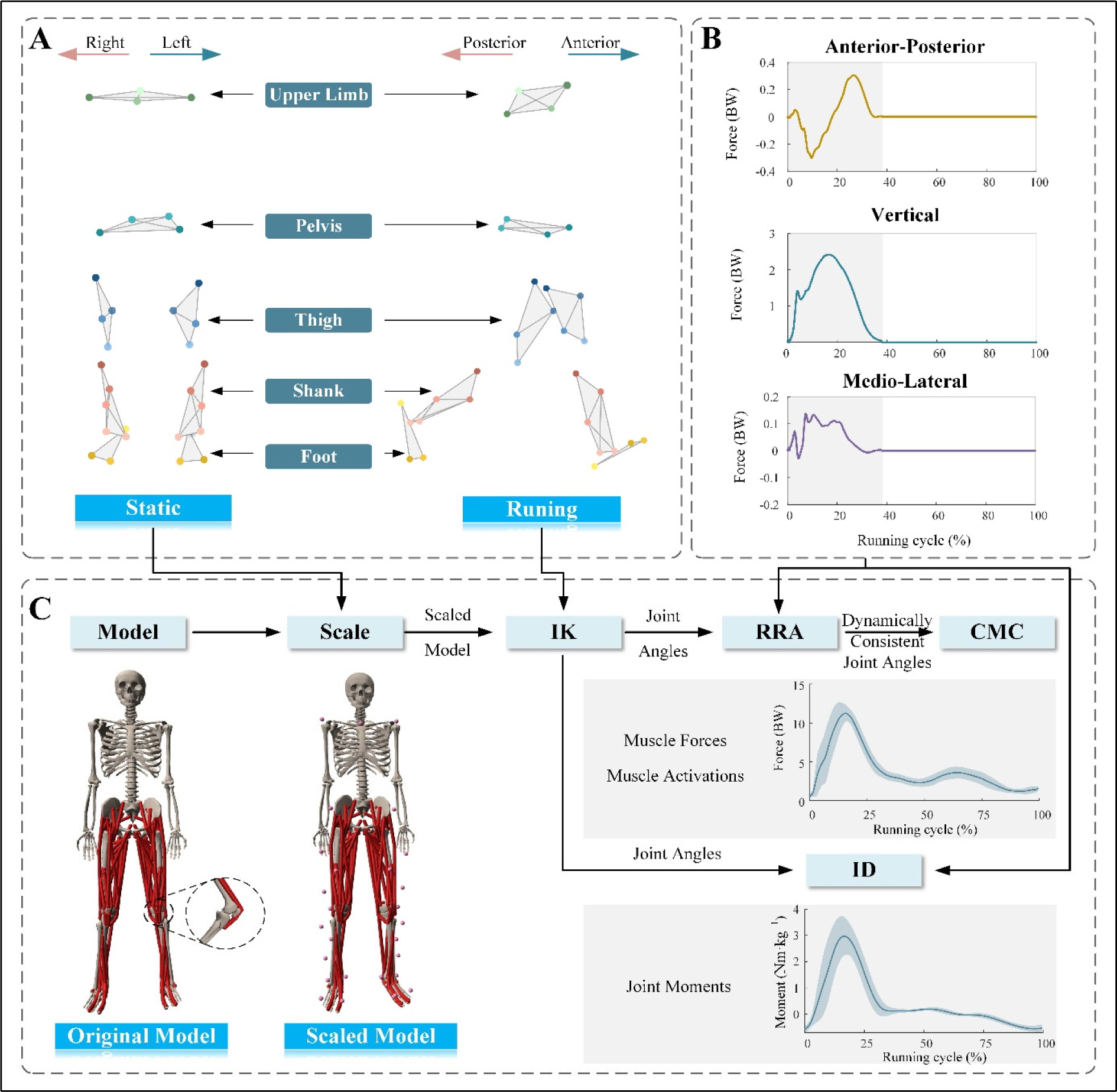 Flowchart of the experiment and inverse dynamic analysis. (A) Visualization of the static marker trajectory (left) and the dynamic marker trajectory (right). The static marker trajectory was used to scale the generic model's segments to each participant's anthropometry. (B) Normalized vertical, anterior-posterior, and medio-lateral GRFs in one sample trial. The stance phase (gray shading) was defined as the period between the foot's initial contact and toe-off in a running cycle. (C) The flowchart for inverse dynamic analysis of each participant's motion with OpenSim. The muscle force and joint moment are normalized to the body weight and body mass, respectively.