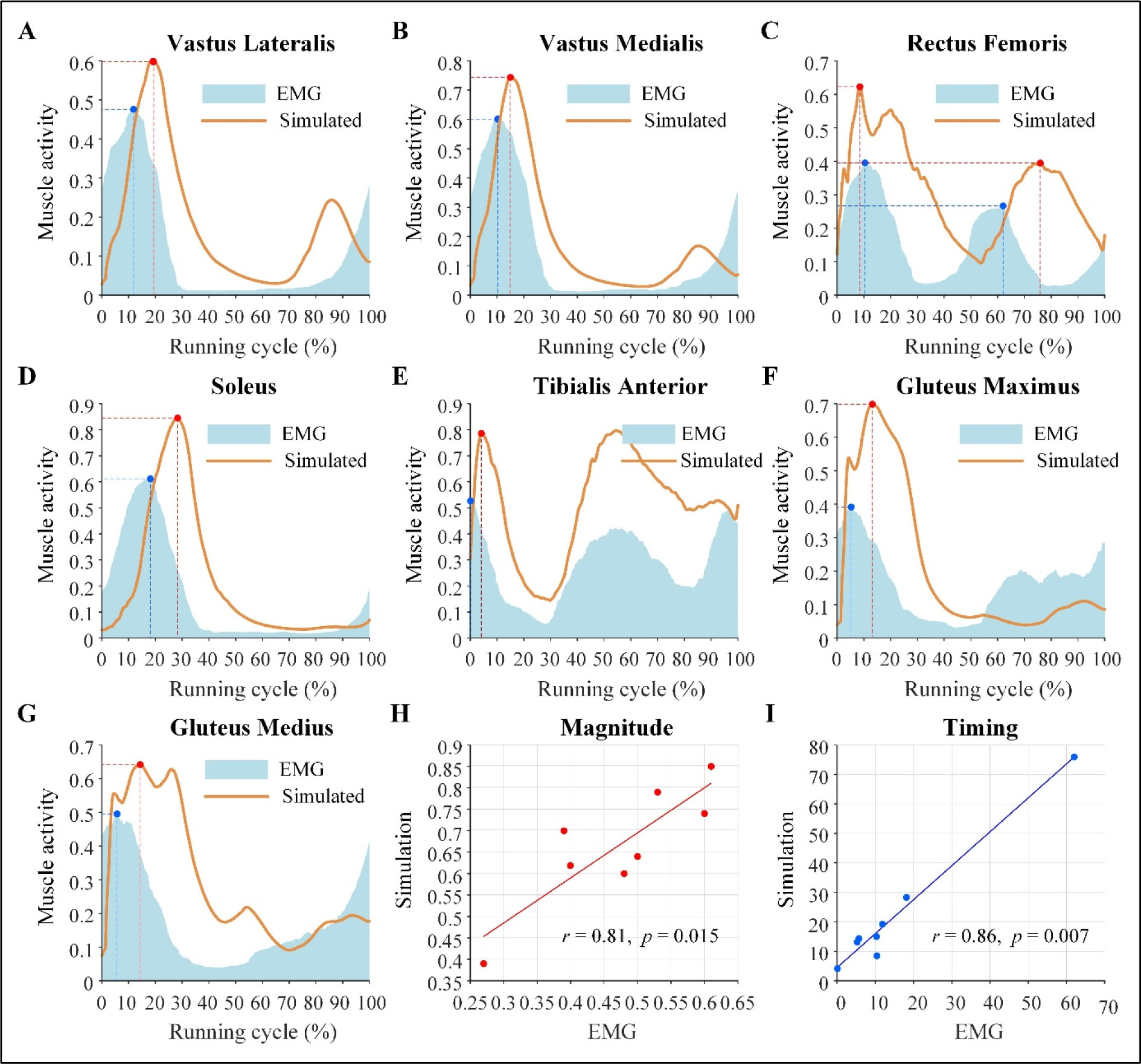 Simulated muscle activity and measured EMG curves along with the magnitude and timing correlations between simulated muscle activity and EMG. (A–G) Simulated muscle activity and measured EMG curves during a full running cycle for the vastus lateralis, vastus medialis, rectus femoris, soleus, tibialis anterior, gluteus maximus, and gluteus medius muscles, respectively. (H) Magnitude correlation between simulated muscle activity and EMG. (I) Timing correlation between peak simulated activity and peak EMG.