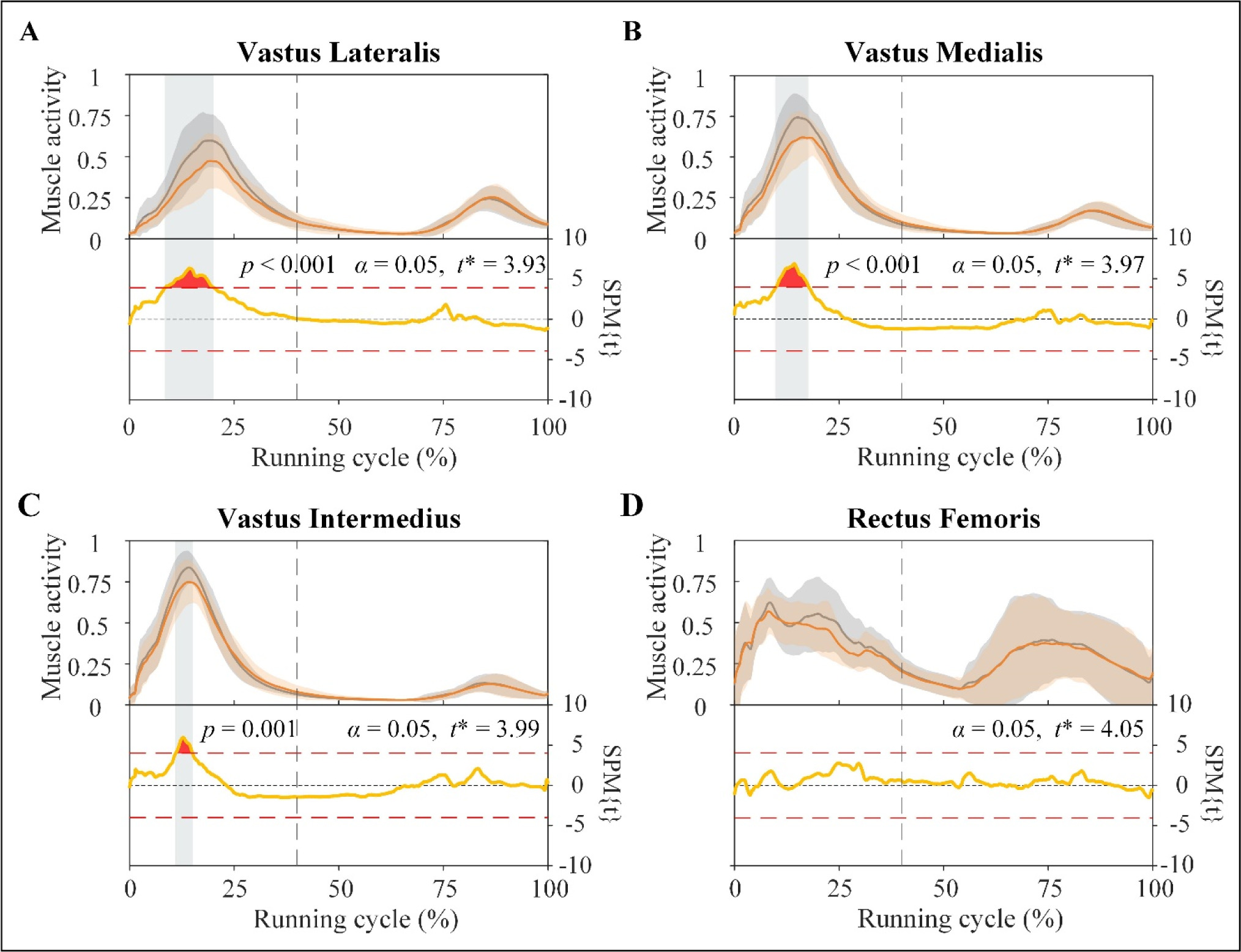 Activity (top) and results of SPM curves (bottom) of vastus lateralis (A), vastus medialis (B), vastus intermedius (C), and rectus femoris (D) muscles. The activity is described as the mean (solid line) ± standard deviation. The shaded areas on the SPM{t} curve show the track locations where the SPM{t} curve exceeded the critical threshold (red dotted line). The p-values are provided for these suprathreshold clusters. Gray dot lines refer to the moment of toe-off.