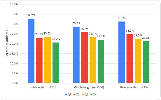 Significant difference was found in the prevalence of RAE between athletes of different sexes among heavyweights (p = 0.02, ES = 0.11). In particular, there were more Q1 athletes (p = 0.02, OR 1.64, 1.08–2.48, ES = 0.11) and fewer Q4 athletes (p = 0.011, OR 0.54 (0.33–0.87, ES = 0.12) among males.