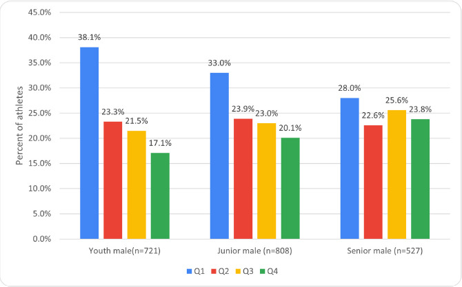 It was also found that for males there were significantly more Q1 athletes (p < 0.001, OR 1.58, 1.24–2.01, ES = 0.10) and significantly fewer Q4 athletes (p = 0.004, OR 0.66 0.5–0.87, ES = 0.08) among youth than seniors. Differences between juniors and seniors were not significant. Differences in RAE between youth and junior athletes were not significant. However, there was a higher proportion of Q1 athletes among youth compared to juniors (p = 0.038, OR 1.25, 1.01–1.54, ES = 0.05) (Figure 3).