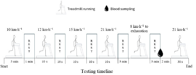 After participants’ body mass and height were collected, one IMU (MTw, 3DOF Human Orientation Tracker, Xsens Technologies B.V. Enschede, the Netherlands) was strapped over the lumbar spine at the L4–L5 level which represents the centre of mass acceleration (Setuain et al., 2016). Each testing session consisted of running on a treadmill-ergometer (ERG-ELEK-EG4, ISSA Engineers, Vitoria, Spain), of which speed was electronically verified by its photocell timer. Each session (Figure 1) started with a warm-up consisting of 5 min of running at 10 km∙h−1 followed by three sets of 10 s at speeds of 12, 15 and 21 km∙h−1. After 3 min of rest, participants performed a maximal incremental continuous running test to exhaustion. The treadmill slope was fixed at 1% of elevation. Initial speed was 8 km∙h−1 and was incremented by 1 km∙h−1 every min (Scrimgeour et al., 1986). After 3 min of the cessation of the test, a capillary whole-blood sample for blood lactate concentration (BLC) was obtained. Finally, 5 min after the end of the incremental test, participants stepped directly onto the moving treadmill (1% slope) and run 30 s at 21 km∙h−1.