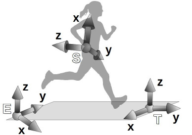 The IMU sensor fusion algorithm computed the orientation of the sensor-fixed reference frame S with respect to an Earth-fixed reference frame E, which was defined with the Z-axis lying on the vertical pointing up and the X-axis pointing to the magnetic North. However, frame E was not related to the treadmill. Since the sensor frame was fixed to the runner’s back, its orientation allowed tracking the runner’s heading (Tan et al., 2008). An additional treadmill-fixed reference frame T was defined by rotating frame E so that the Y-axis pointed to the average heading direction (Figure 2). Furthermore, the runner’s heading in the T reference frame, that is, the projection of a vector along the negative z-axis of the S reference frame onto the x-y plane of the T reference frame, was used to determine the leg of each contact.