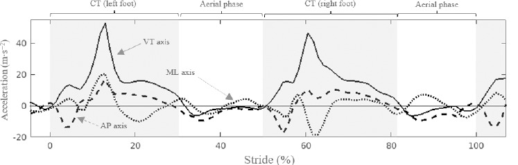 Example of running task phases from an acceleration by stride (%) curve analysis description. Horizontal line corresponds to the 0-acceleration value (m∙s−2). Sold line corresponds to the vertical (VT) axis. Dashed line corresponds to the anteroposterior (AP) axis. Dotted line corresponds to the mediolateral (ML) axis. The shading area indicates contact intervals for the left and right legs. CT = Contact time.
