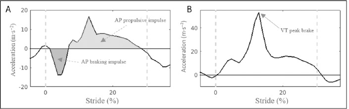 Figure 4A plots the AP acceleration-stride pattern during the contact and the beginning of the aerial phase from a stride in one representative subject. The contact phase was novelty divided into braking and propulsion sub-phases according to negative and positive horizontal accelerations, respectively. AP braking and propulsive impulses (m∙s−1) were defined as the area under the acceleration curve during the braking and propulsive phases, respectively, in each contact phase. These impulses represented the change of velocity in the braking and propulsion phases. It is worth noting that during the aerial phase of the stride, there was a negative acceleration pattern. To the best of our knowledge, this is the first study in analysing the role of accelerometry in the AP impulse-based variables. VT peak brake (m∙s−2) was defined as the maximal value in the VT axis (Figure 4B).