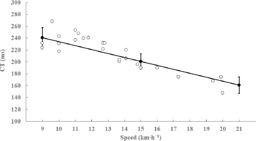 Table 1 shows no differences concerning all measured variables at all three speeds between the first and the second test (p > 0.05; ES < 0.26; trivial to small). Linear regression between both days for each variable at any speed showed the presence of non-significant systematic errors (R2 < 0.07; p > 0.05). ANOVA showed the presence of random errors in CT (0.04 ms), ST (0.12 ms), SL (0.002 m), SF (0.001 strides∙min−1), the AP braking impulse (0.001 m∙s−1), the AP propulsive impulse (0.003 m∙s−1), and VT peak brake (0.42 m∙s−2). The spatiotemporal variables showed significant differences among the all considered speeds (9, 15 and 21 km∙h−1; p < 0.01; ES range= 2.5–5.4; very large). Figure 5 shows similar IMU-based CT values from 9 to 21 km∙h−1 compared with those published with instrumented treadmills (mean difference: 2.4 ms; r = 0.90; p < 0.001). Concerning kinetic variables: the AP braking impulse was only different between 9 and 21 km∙h−1 (p < 0.01; ES = 0.80; moderate), the AP propulsive impulse was significantly different among the three speeds (p < 0.05; ES range = 0.82–2.6; moderate to very large), and VT peak brake was not different between any speed (p > 0.05; ES < 0.67; trivial to moderate).