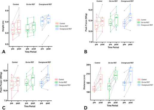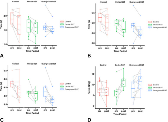 There was a significant group*time point interaction effect for peak force [F(2,21) = 5.651; p < 0.011; ηp2 = 0.361; large]. Post-hoc analyses indicated pre- to post-testing changes for the overground RST group (mean difference = 183.81 N; p = 0.007; Cohen’s d = 0.50; small) and for the on-ice RST group (mean difference = 150.69 N; p = 0.065; Cohen’s d = 0.40; small).