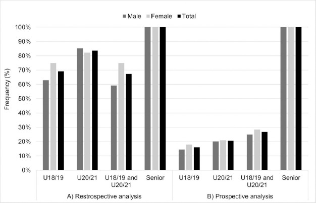 The most successful athletes in the adult category also participated in the youth categories. Among athletes who participated in the Olympic Games or Senior World Championships from 2004 to 2022, over 80% (46/55) had competed in the U20/21 category, nearly 70% (38/55) in the U18/19 category, and more than 60% (37/55) in both of the aforementioned categories earlier in their careers (Figure 1A). Regarding the prospective analysis, 16% (38/235) of athletes who participated in the U18/19 category, 21% (47/229) of athletes who participated in the U20/21 category, and 27% (37/138) of athletes who participated in both categories were later called up to participate in an edition of the Olympic Games and/or the Senior World Championships (Figure 1B).
