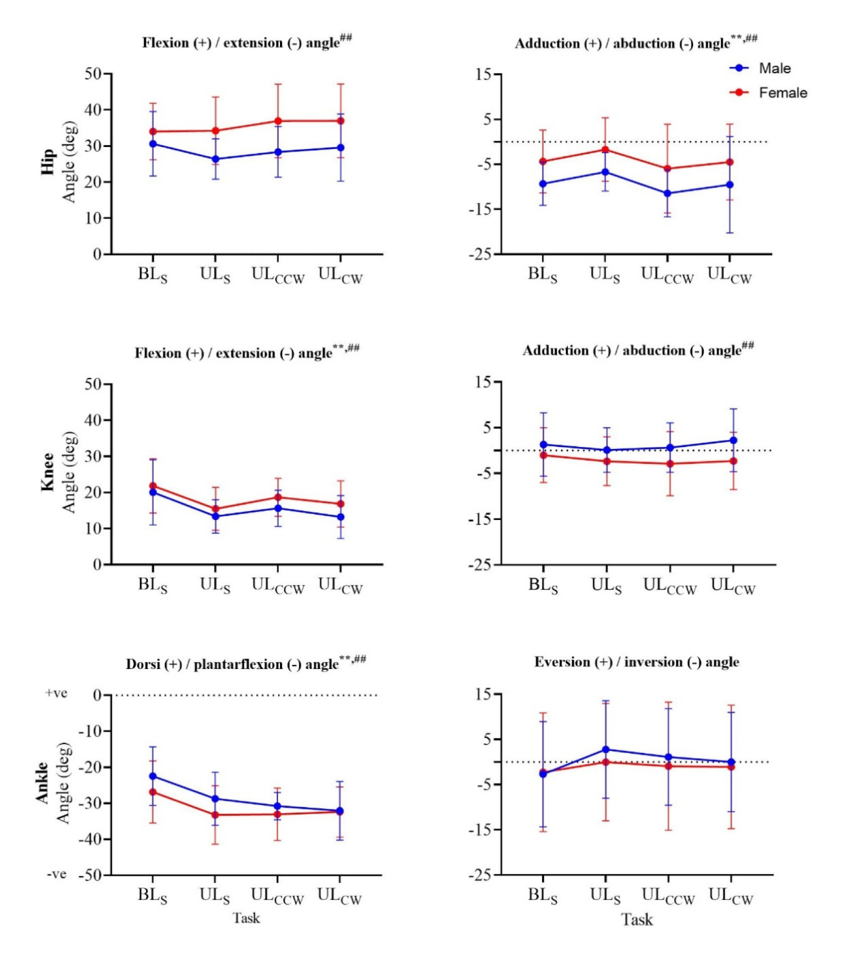 Although there was no main effect of sex on knee flexion or adduction at IC (Figure 2), during the rotational landings, females landed with a significantly more flexed (ULCW, ULCCW, p = 0.003) and less adducted (ULCCW, p < 0.001) knee compared to males. Significant main effects for the landing task were found for knee flexion (p < 0.001, ηp2 = 0.29) and adduction (p < 0.001, ηp2 = 0.07) at IC.