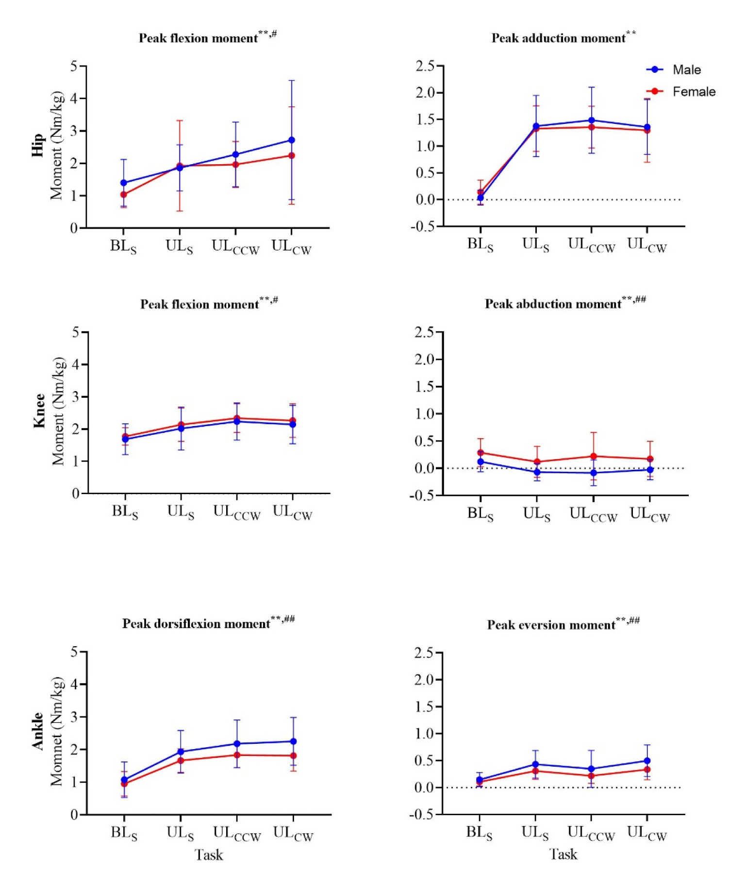 Peak joint moments in the sagittal (left column) and the frontal (right column) plane of all four landing tasks for males (blue) and females (red).