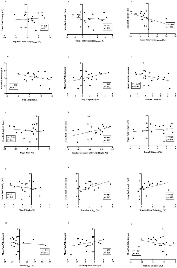 The relationship between lower limb strength, push technique asymmetry, and performance is illustrated in Figure 1. Analysis revealed a moderate negative correlation between the symmetry angle of peak torque of ankle dorsiflexion at 60°/s and mean push velocity (r = −0.48, p = 0.06). In terms of kinematic asymmetry indicators during the push phase, both the symmetry angle of the center of gravity height (r = 0.50, p = 0.05) and the hip joint angle (r = 0.54, p = 0.03) at the touchdown showed a moderate positive correlation with mean push velocity. Conversely, the symmetry angle for contact time exhibited a moderate negative correlation with mean push velocity (r = −0.48, p = 0.06). No significant correlation was observed between kinetic asymmetry indicators and push performance.