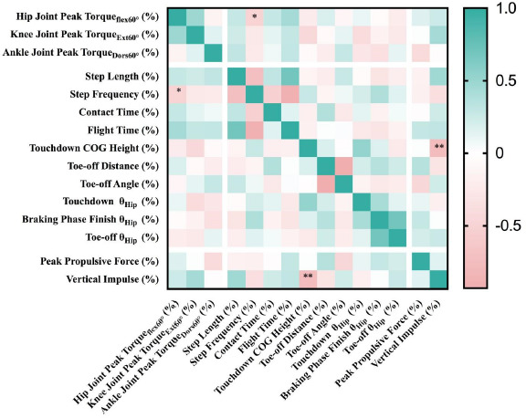 The relationship between strength and push technique asymmetry is illustrated in Figure 2. A moderate negative correlation was identified between the symmetry angle of hip flexion peak torque at 60°/s and step frequency (r = −0.49, p = 0.05). Additionally, a strong negative correlation was observed between the symmetry angle of the center of gravity height at the touchdown and vertical impulse (r = −0.77, p = 0.01). No significant correlations were found between other asymmetry indicators across limbs.