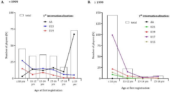 Before 1999, most international players were registered for the first time when they were 19 years old or older (31%). There was a general dispersion in the frequencies of internationalization among players aged 10 to 15–16 years. Notably, players who achieved their first international appearances in under-19 and under-23 teams typically began practicing futsal at the age of 10 or younger, with 33% and 60% starting when they were ≤ 10 years old, respectively. However, 67 players (92%) who achieved their first international appearance in the national senior team started practicing futsal at the age of 19 or older (Figure 2, panel A). Conversely, after 1999, 144 international players were registered for the first time at the age of 10 or younger (82%). No players from this group achieved the adult national team (Figure 2, panel B). Table 1 presents the cross-tabulations of international players by age at the time of first registration and their first internationalization, before and after 1999.