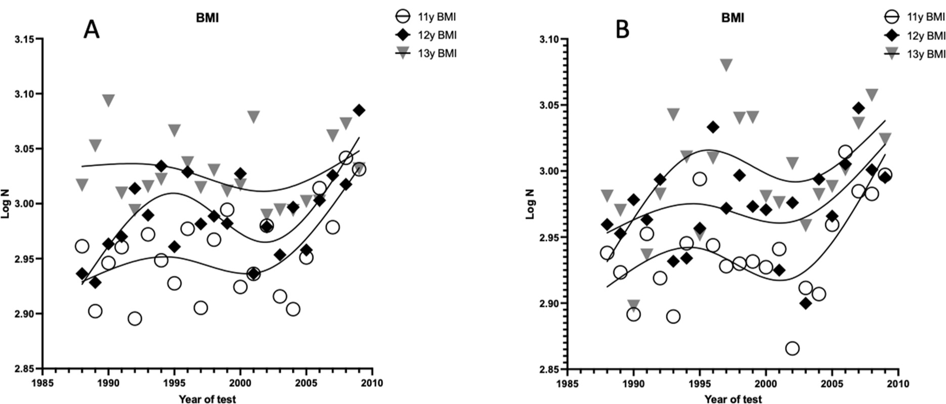 All data were manually entered into a spreadsheet and were checked for transcription errors, making corrections where appropriate. The dataset was also controlled for outliers where the execution time was close to zero and/or over twice the time of test-specific average performance (4 x 5 m, 30 m, 60 m). Similarly to other studies (Hanssen-Doose et al., 2021; Lovecchio et al., 2022), we first pooled the data into three-year study waves (e.g., 1990–92, 1993–95, … 2008–10) and then stratified our analysis into test-sex-age-specific groups (e.g., 11-year-old boys tested on the 4 x 5 m). Firstly, we calculated the natural logarithm (ln) of the body mass index (BMI) and represented it graphically to describe its changes over the years. Figure 1 illustrates this temporal trend for children aged 11–13 years between 1990 and 2010, showing an increase in the BMI over time.