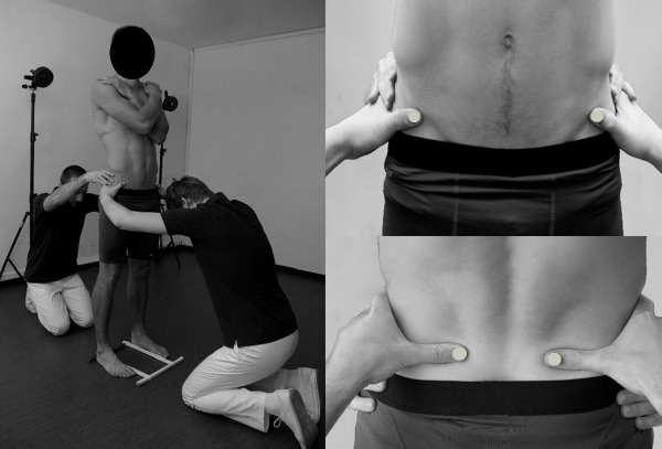 To evaluate PA, the motion capture system BTS Smart (BTS Bioengineering, Milan, Italy) was used in a non-standard manner. In this system, reflexive markers placed on the surface of the subject's body are illuminated by the infrared light source, and reflections are captured by a set of six cameras. After computer processing, the x, y, and z coordinates of the markers in the given reference space are calculated with the frequency of 60 Hz. In our non-standard approach, raters' thumbnails were specially equipped with semispherical markers (diameter of 10 mm) for the purpose of iliac spines palpation and registration of their positions. To standardize foot placement, a plastic frame was mounted on the floor. Participants pushed the inner and posterior borders of their feet against its bars (the distance between the inner borders of the frame was 23.5 cm) (Gnat and Biały, 2015). After proper positioning of the participant, raters firmly grasped his/her pelvis placing thumbs equipped with markers directly under the target anatomical landmark, so that the upper border of their thumbs 'supported' either the ASs (rater 1) or PSs (rater 2). Subsequently, raters gave command 'start' to the technician operating the motion capture system. Three 5-second static registrations of the pelvic spine position, ASs and PSs, were recorded. This measurement method reduced the risk of marker detachment and the firm grasp of the pelvis by the two raters stabilized it and minimized the influence of the postural sway on the outcome. The reliability and the detailed methodology of the measurement have been reported earlier (Gnat and Biały, 2015) (Figure 1).
