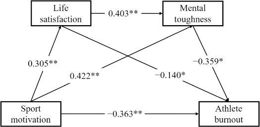 Chain mediation model of the relationship among sport motivation, life satisfaction, mental toughness, and athlete burnout in male adolescent athletes.