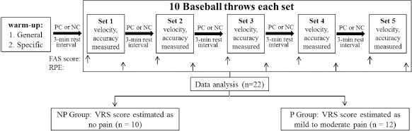 Within this framework, this study aimed to investigate whether the application of intermittent PC would have an ergogenic effect on throwing velocity and examine whether PC would affect throwing accuracy. Perceptual responses during the workout were measured as a secondary outcome. The results were divided into two groups based on whether the participants experienced pain from cooling. We hypothesized that PC would increase baseball throwing velocity, but decrease throw accuracy in participants who did not feel cooling-induced pain and decrease baseball throwing velocity and throw accuracy in participants who felt cooling-induced pain.