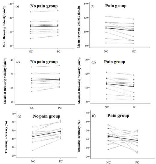 Individual (dotted lines, open circles) and average (solid line, filled circle) throwing performance under NC and PC conditions with the individual values. (a) Mean throwing velocity in participants classified as experiencing no pain (n = 10) by the verbal rating scale (VRS) after the PC condition; (b) Mean throwing velocity in participants classified as having mild or moderate pain (n = 12) by the VRS after the PC condition; (c) Maximal throwing velocity in participants classified as experiencing no pain (n = 10) by the VRS after the PC condition. (d) Maximal throwing velocity in participants classified as having mild or moderate pain (n = 12) by the VRS after the PC condition; (e) Mean throwing accuracy in participants classified as experiencing no pain (n = 10) by the VRS after the PC condition; (f) Mean throwing accuracy in the participants who were classified as having mild or moderate pain (n = 12) by the VRS after the PC condition