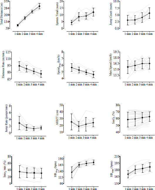 Abbreviations: m = meters; num = number; min = minute; AHJZT = Average Height Jump Zone Total; cm = centimetres; SmO2 Rest = Muscle oxygen saturation; min = minimum; HRAvg = Average Heart Rate; bpm = beats per minute; max = maximum
