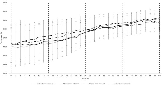 Fluctuations in SmO2 values during 60-s recovery periods, following 1, 2, 3, and 4 min of play in a 3x3 basketball game. Data are presented as absolute values (mean ± SD).