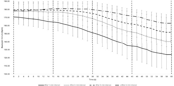 Fluctuations in HR values during 60-s recovery periods, following 1, 2, 3, and 4 min of play in a 3x3 basketball game. Data are presented as absolute values (mean ± SD).