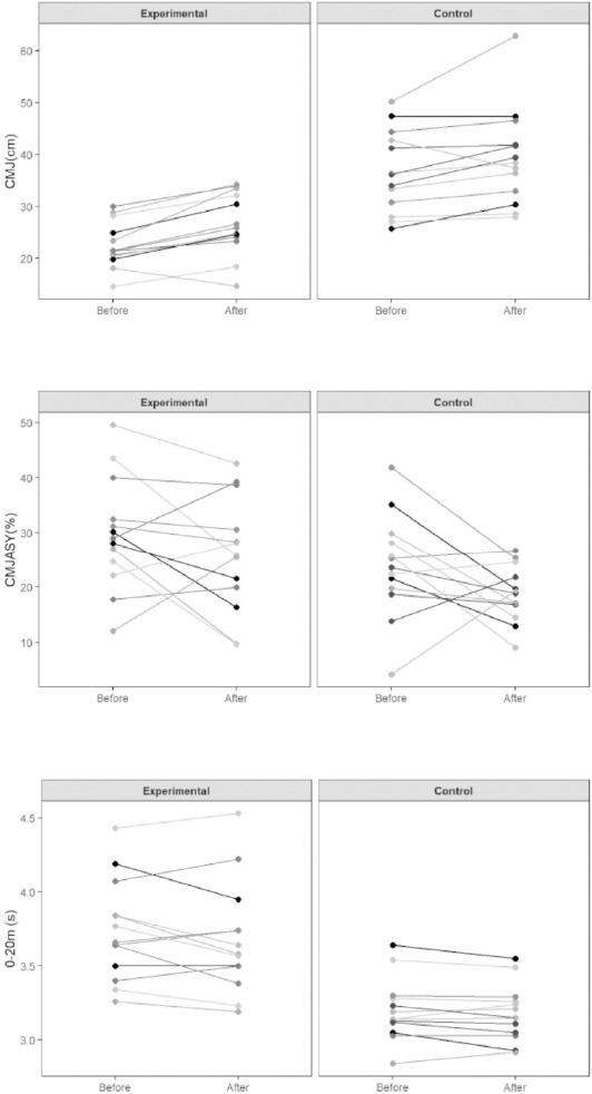 After the training program, the experimental group significantly (BF10 > 100) improved the CMJ bilateral jump height with a large effect (Table 3, Figure 1). Moreover, in both CMJR and M505R, moderate evidence for H1 (BF10 > 3 to 10) was revealed after the training program (δ ranged from 0.66 to 1.12). For the control group, moderate evidence for H1 (BF10 > 3 to 10) in M505R and M505L (δ = 0.65) was observed.