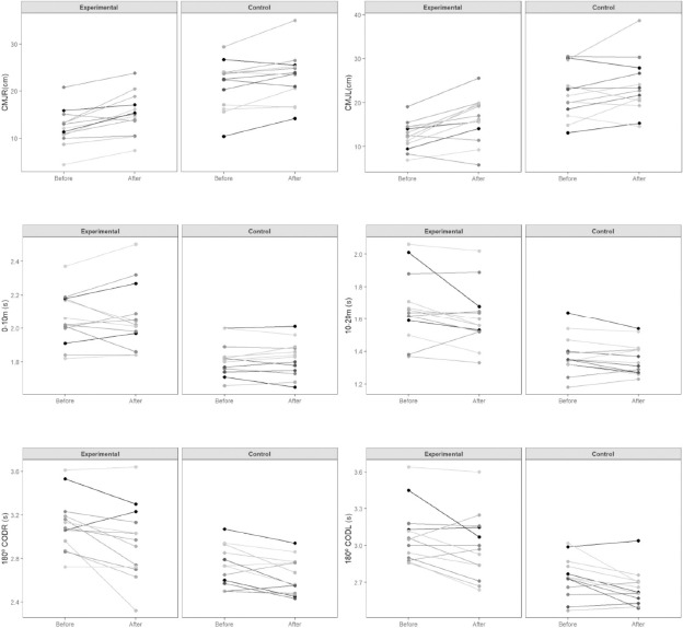 According to the Bayesian Repeated Measures ANCOVA, the model including Time + Group + Experience + Age provided the best fit for the data in the CMJ and the CMJR. Regarding the CMJ, strong evidence was observed for the proposed model (BFM = 10.434) over the null model. Considering this variable, the model found was 1.13 times more likely than the second model including Time + Experience + Age. For the CMJL, the model including Time + Experience + Age provided the best fit for the data. There was strong evidence for the proposed model (BFM = 10.809) over the null model. The model found was 1.29 more likely than the second model including Time + Group + Experience + Age. The best model for CMJASY was Time + Group, but only with moderate evidence (BFM = 3.543). In the sprinting variables, the model including Group + Height + Age provided the best fit for the data in 0–10-m (BFM = 6.348) and 0–20-m (BFM = 6.420) sprinting time, but only with moderate evidence. For 10–20-m sprinting time, the model including Time + Group + Experience + Height + Age provided the best fit for the data (BFM = 6.008). In the change of direction tests, the model including Time + Group + Height + Age was the best fit for the data on the right (BFM = 10.378) and left (BFM = 8.196) sides. About M505R, strong evidence was found for the proposed model over the null model. Furthermore, this model was 1.538 times more likely than the second model including Time + Height + Age.